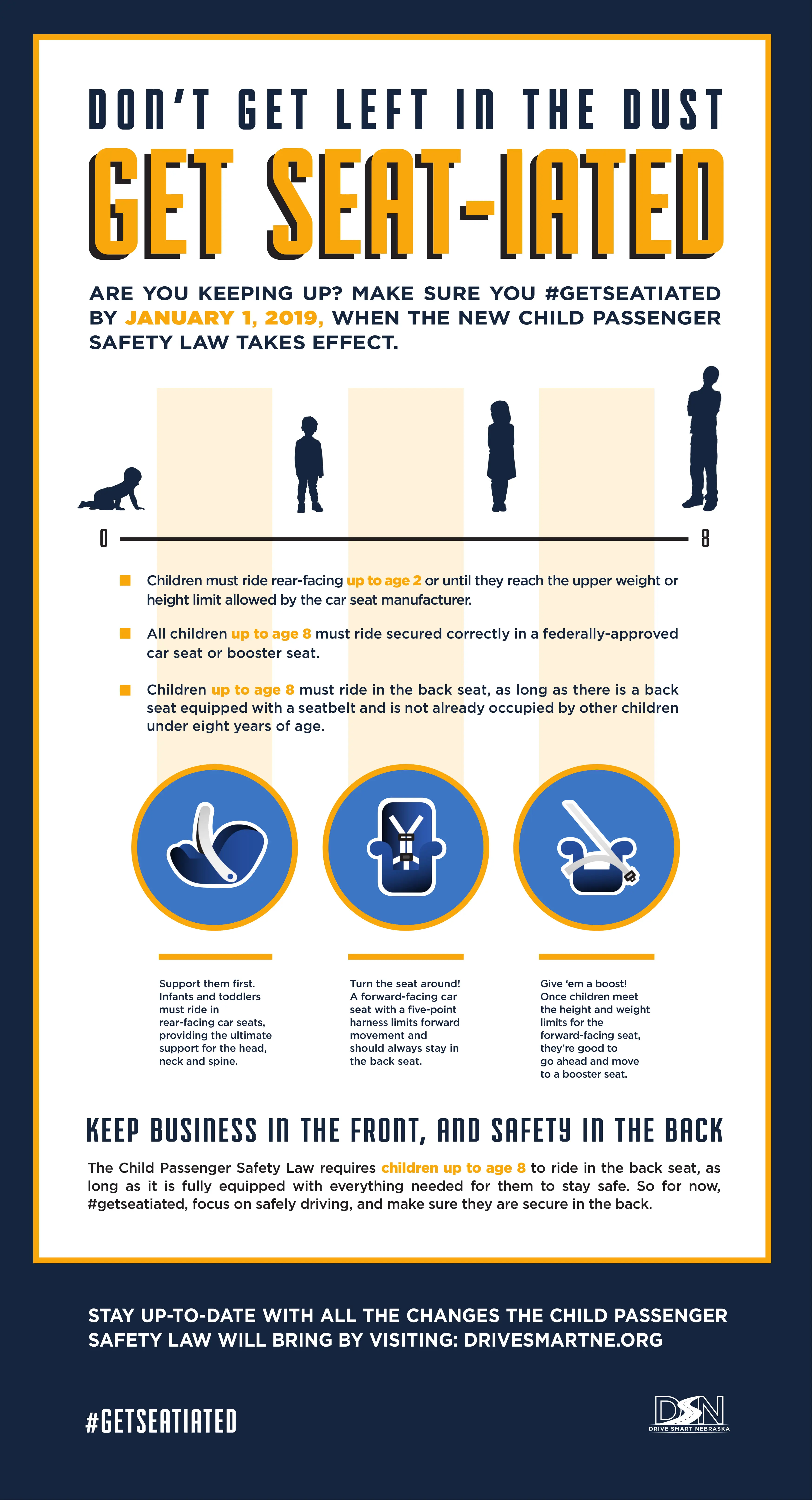 As of January 1, 2019, Nebraska’s LB42 requires parents and caregivers to buckle children in the back seat whenever they can do so. As part of its “Get Seat-iated” campaign, parents are encouraged to take the time to learn as much as they can to keep their kids as safe as possible!