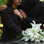 Read more about A grieving couple dressed in black stands beside a memorial table with a bouquet of white lilies, symbolizing loss and remembrance. The image conveys the emotional weight of wrongful death cases in Nebraska and represents a surviving spouse seeking justice and compensation for their loved one’s untimely death.
